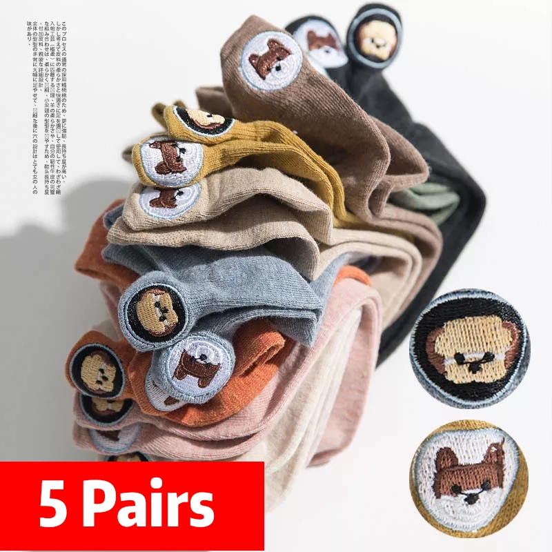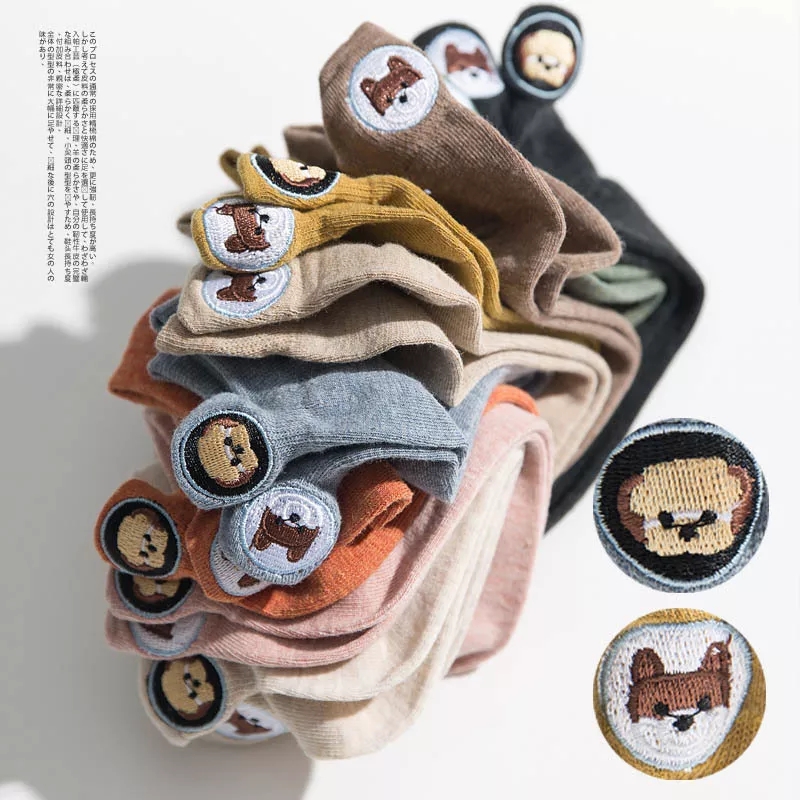 (10 pairs)Woman Cute Embroidered Cartoon Bear Cotton Socks Kawaii Candy Color Breathable Comfortable Boat Socks Female Casual Sock Ladies Ankle Socks
